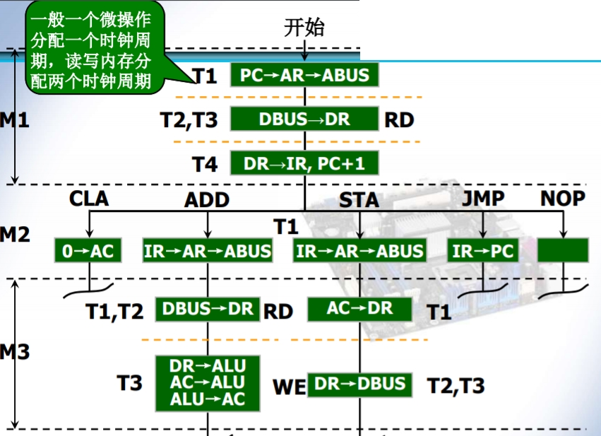 访存操作需要两个时钟周期,其他操作1个时钟周期。每个节拍电位中可以有数量不等的时钟周期。读指令自身一个节拍电位
